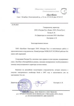 "ООО "БалтКам" благодарит ООО "Роктрак Рус" за качественную работу и продолжительное сотрудничество".